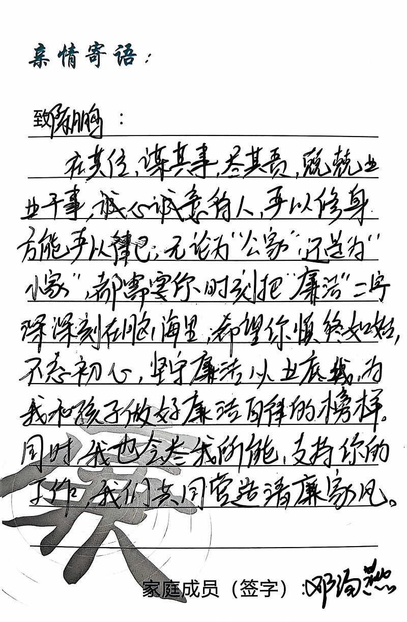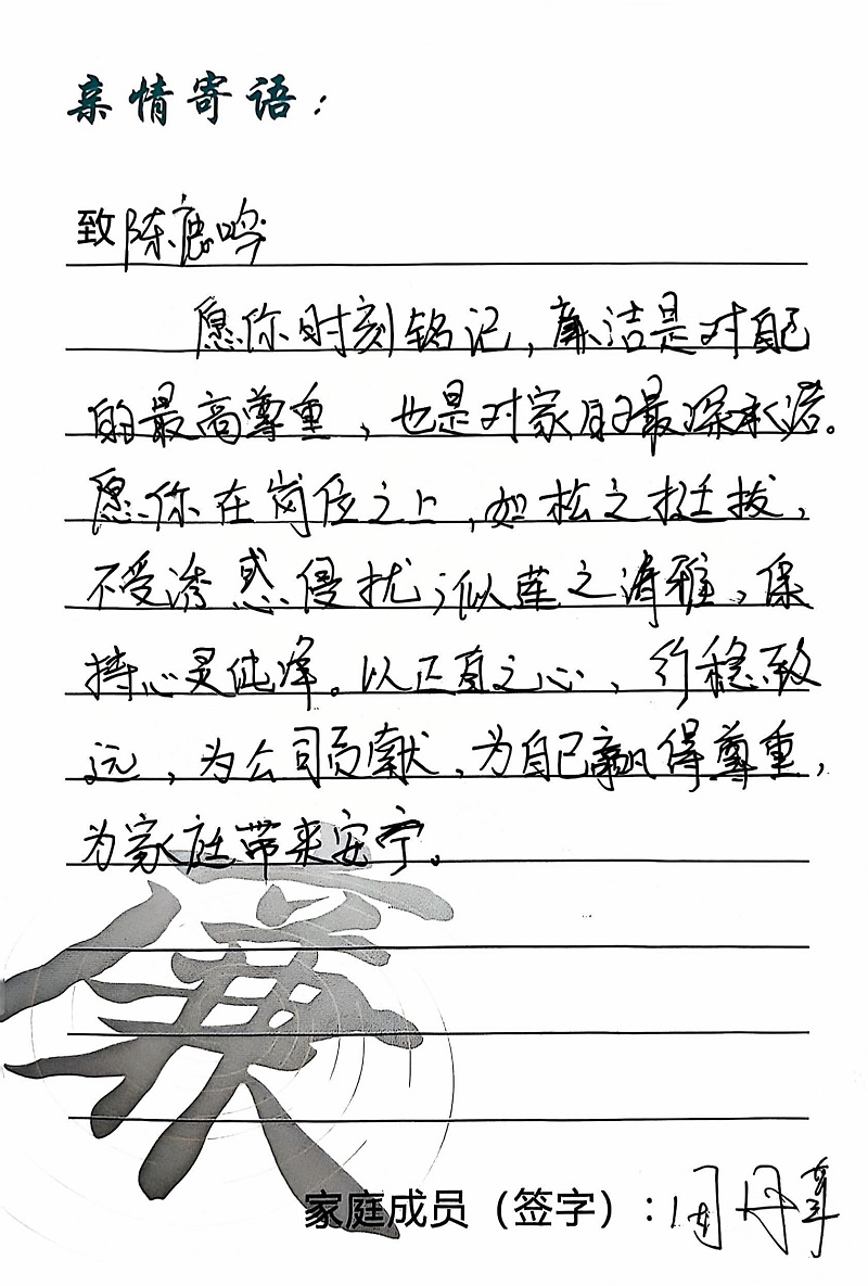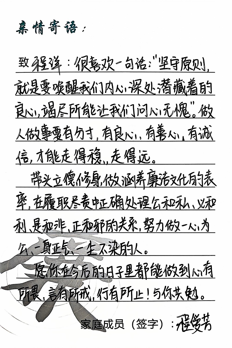 為深入學(xué)習(xí)黨的二十大精神,貫徹落實(shí)習(xí)近平總書(shū)記關(guān)于注重家庭家教家風(fēng)建設(shè)的重要論述,營(yíng)造公司崇廉、尚廉、踐廉、助廉的良好氛圍,城投公司組織開(kāi)展了“家滿清風(fēng)·廉潤(rùn)城投”廉潔文化活動(dòng)。活動(dòng)開(kāi)展以來(lái),共征集廉政寄語(yǔ)210余條。經(jīng)各部門、子公司推薦,城投公司相關(guān)部門審核,評(píng)選出優(yōu)秀廉潔寄語(yǔ)43條。現(xiàn)將優(yōu)秀廉政寄語(yǔ)分批次進(jìn)行展播,快來(lái)一起欣賞吧!