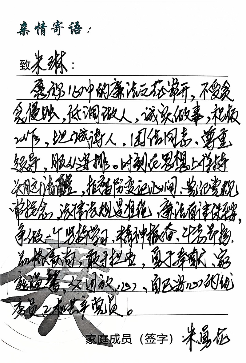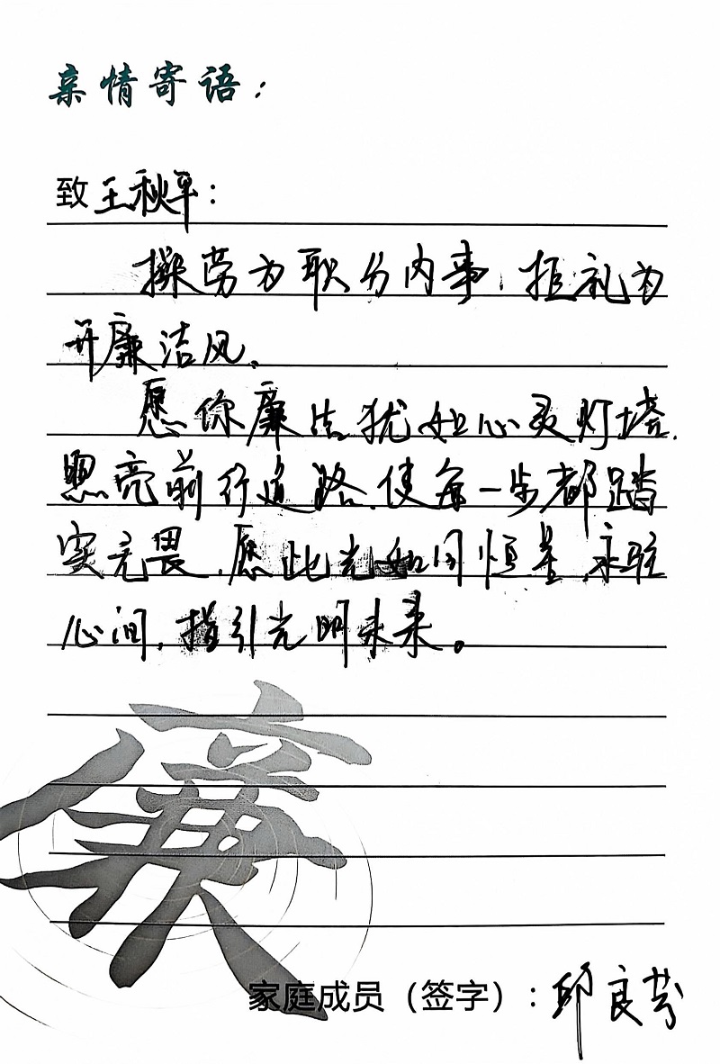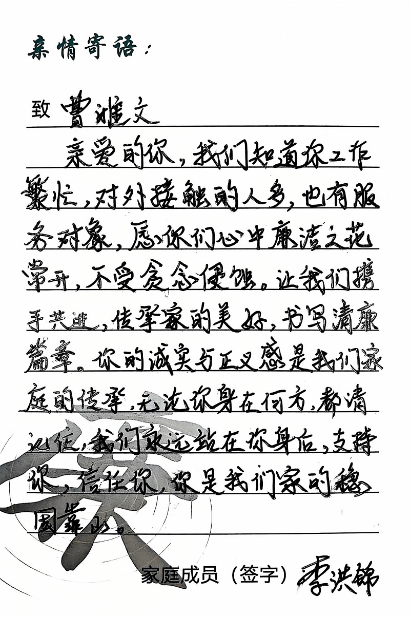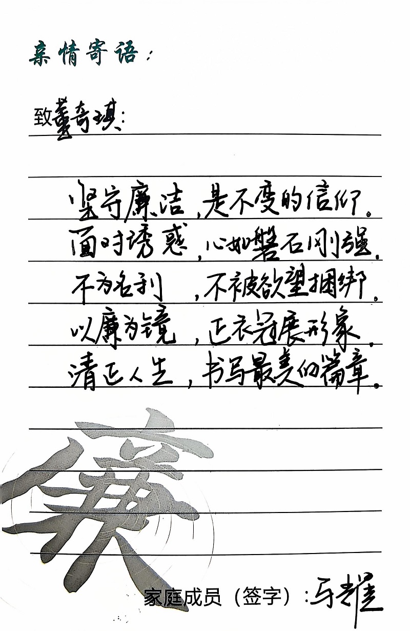 為深入學(xué)習(xí)黨的二十大精神,貫徹落實(shí)習(xí)近平總書(shū)記關(guān)于注重家庭家教家風(fēng)建設(shè)的重要論述,營(yíng)造公司崇廉、尚廉、踐廉、助廉的良好氛圍,城投公司組織開(kāi)展了“家滿清風(fēng)·廉潤(rùn)城投”廉潔文化活動(dòng)。活動(dòng)開(kāi)展以來(lái),共征集廉政寄語(yǔ)210余條。經(jīng)各部門、子公司推薦,城投公司相關(guān)部門審核,評(píng)選出優(yōu)秀廉潔寄語(yǔ)43條。現(xiàn)將優(yōu)秀廉政寄語(yǔ)分批次進(jìn)行展播,快來(lái)一起欣賞吧!