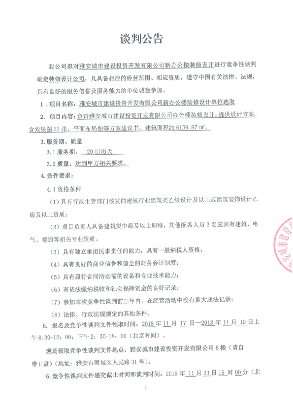 雅安城市建設(shè)投資開發(fā)有限公司新辦公樓裝修設(shè)計(jì)方案競爭性談判