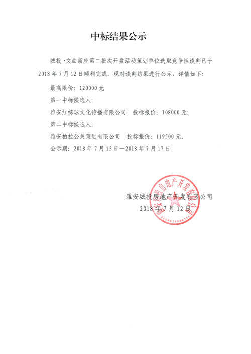 城投·文曲新座第二批次開盤活動競爭性談判中標結果公示