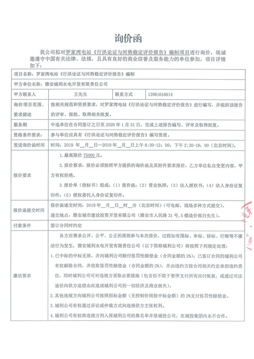羅家灣電站《行洪論證與河勢穩(wěn)定評價報告》編制詢價函