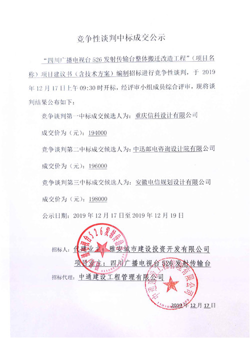 四川廣播電視臺(tái)526發(fā)射傳輸臺(tái)整體搬遷改造工程項(xiàng)目建議書(含技術(shù)方案)編制招標(biāo)競爭性談判中標(biāo)成交公示
