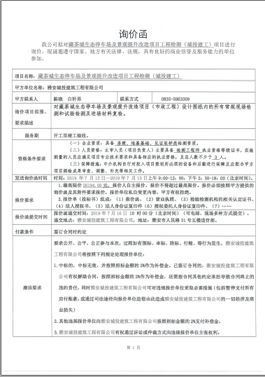 藏茶城生態(tài)停車場及景觀提升改造項(xiàng)目工程檢測詢價函