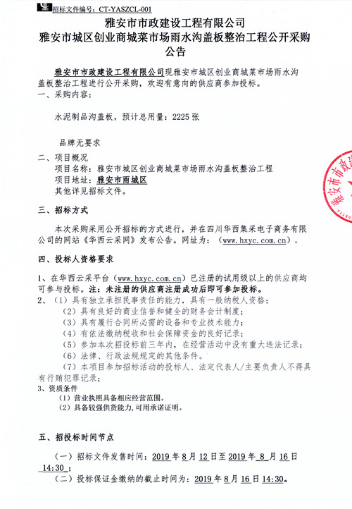 雅安市城區(qū)創(chuàng)業(yè)商城菜市場雨水溝蓋板整治工程公告