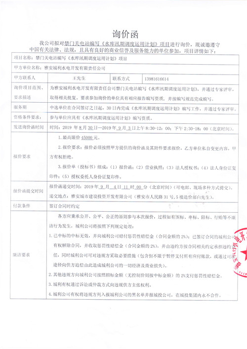 雅安城利水電開發(fā)有限責任公司禁門關(guān)電站編寫《水庫汛期調(diào)度運用計劃》項目競爭性談判公告