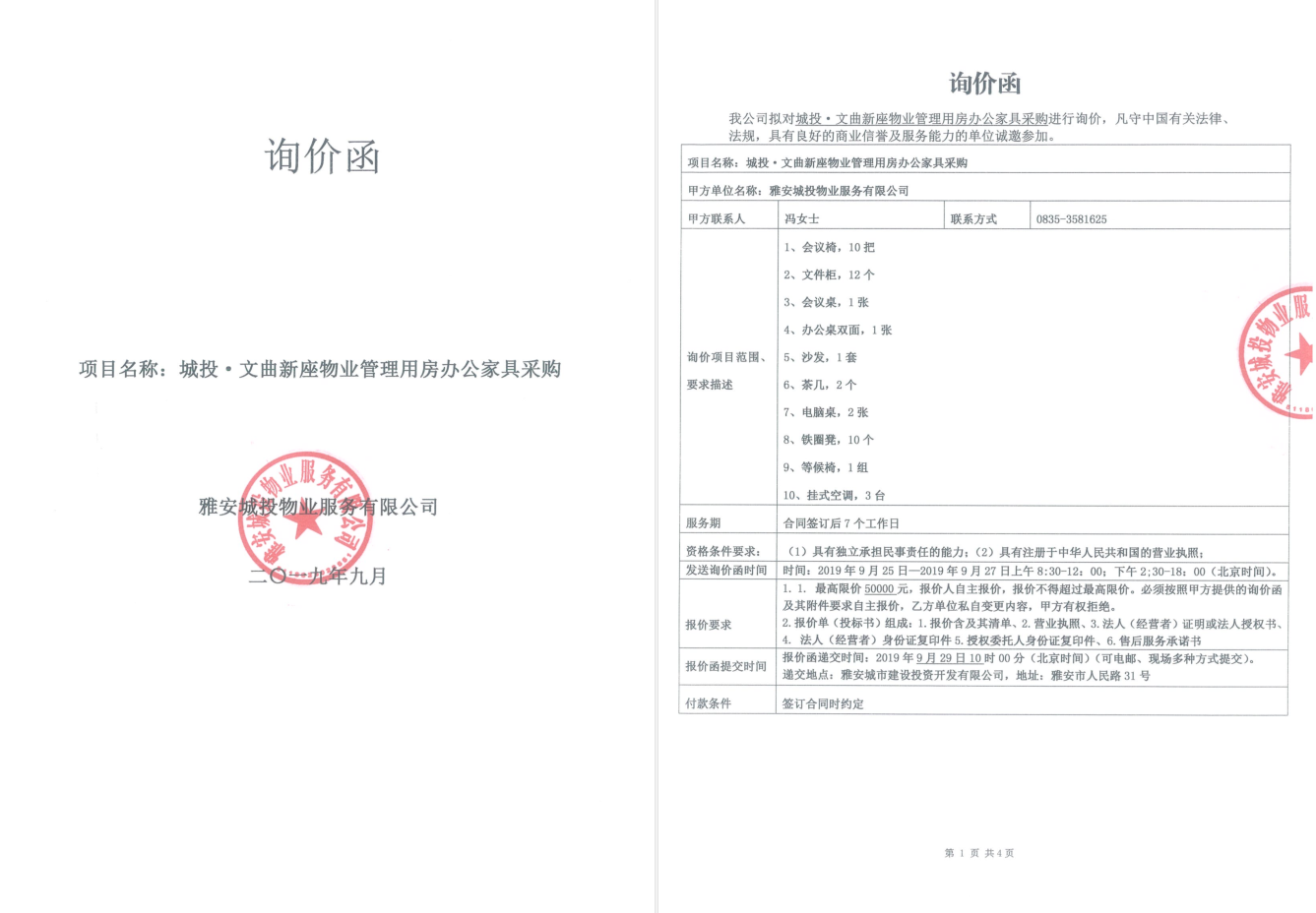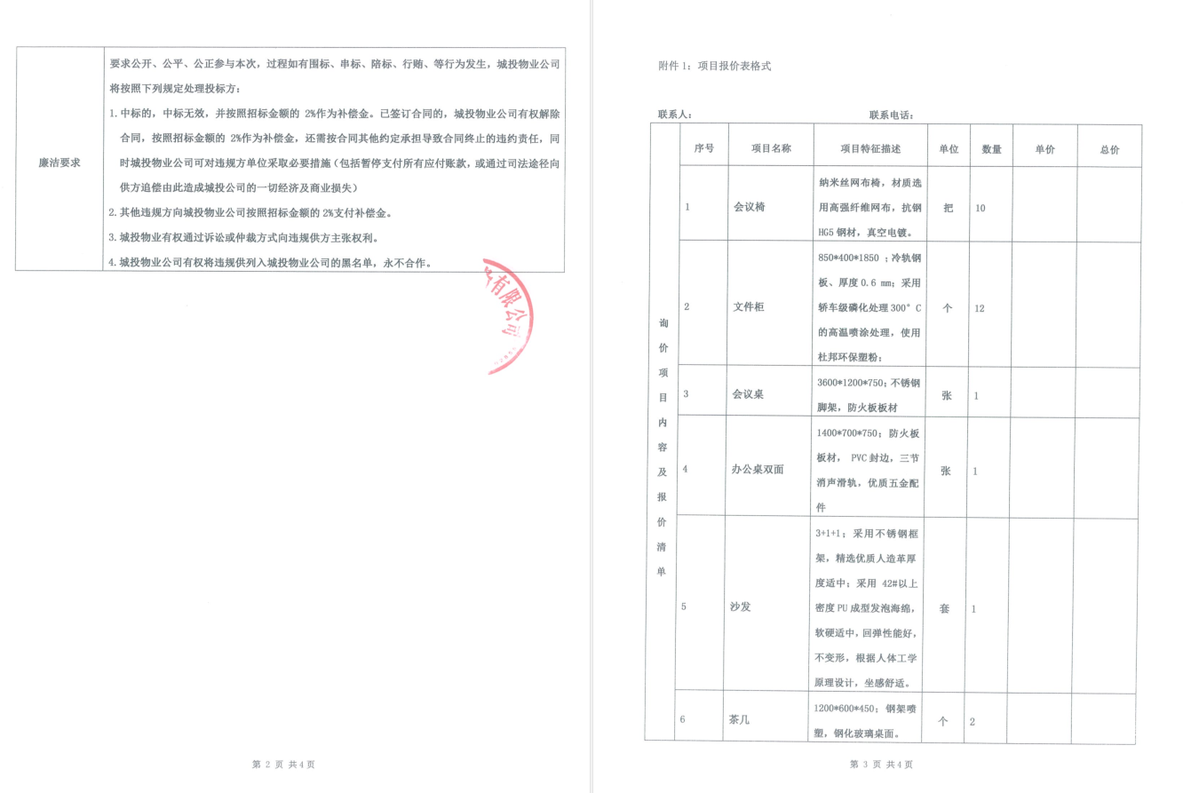 城投·文曲新座物業(yè)管理用房辦公家具采購詢價函