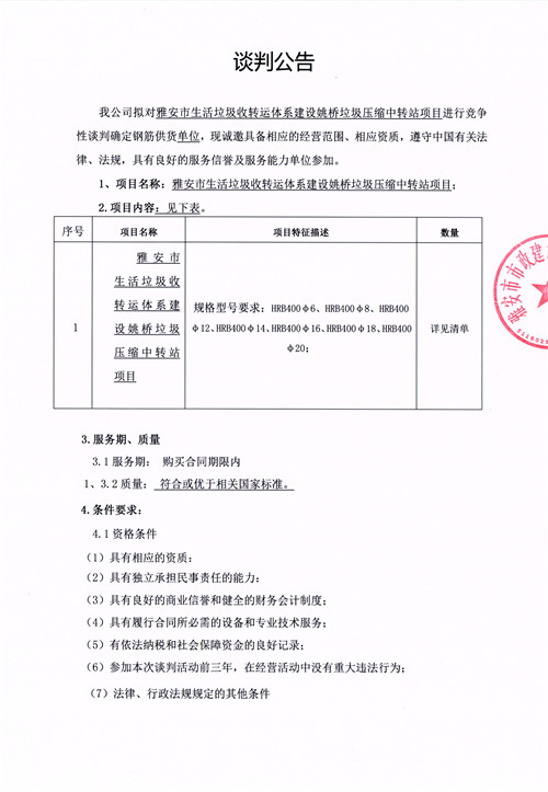 雅安市生活垃圾轉(zhuǎn)運(yùn)體系建設(shè)姚橋垃圾壓縮中轉(zhuǎn)站項(xiàng)目確定鋼筋供貨單位的競爭性談判公告