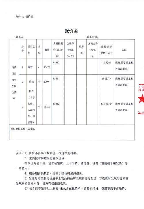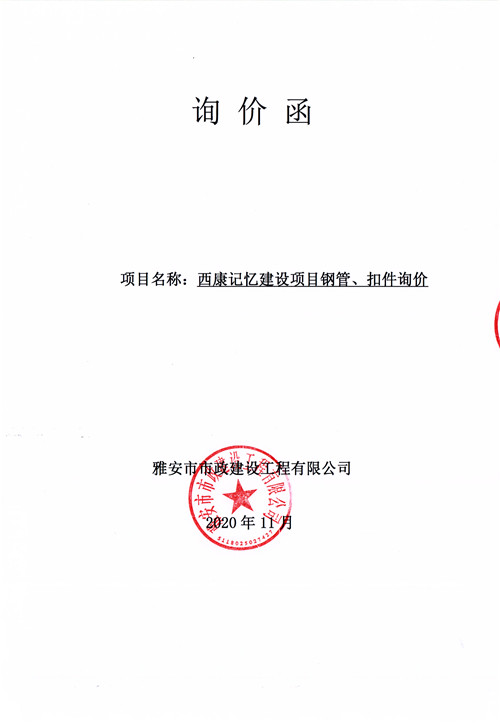 市政公司西康記憶建設(shè)項目鋼管、扣件詢價函