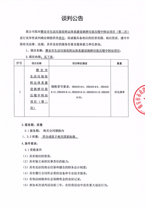 雅安市生活垃圾轉(zhuǎn)運體系建設(shè)姚橋垃圾壓縮中轉(zhuǎn)站項目確定鋼筋供貨單位的競爭性談判公告(第二次)