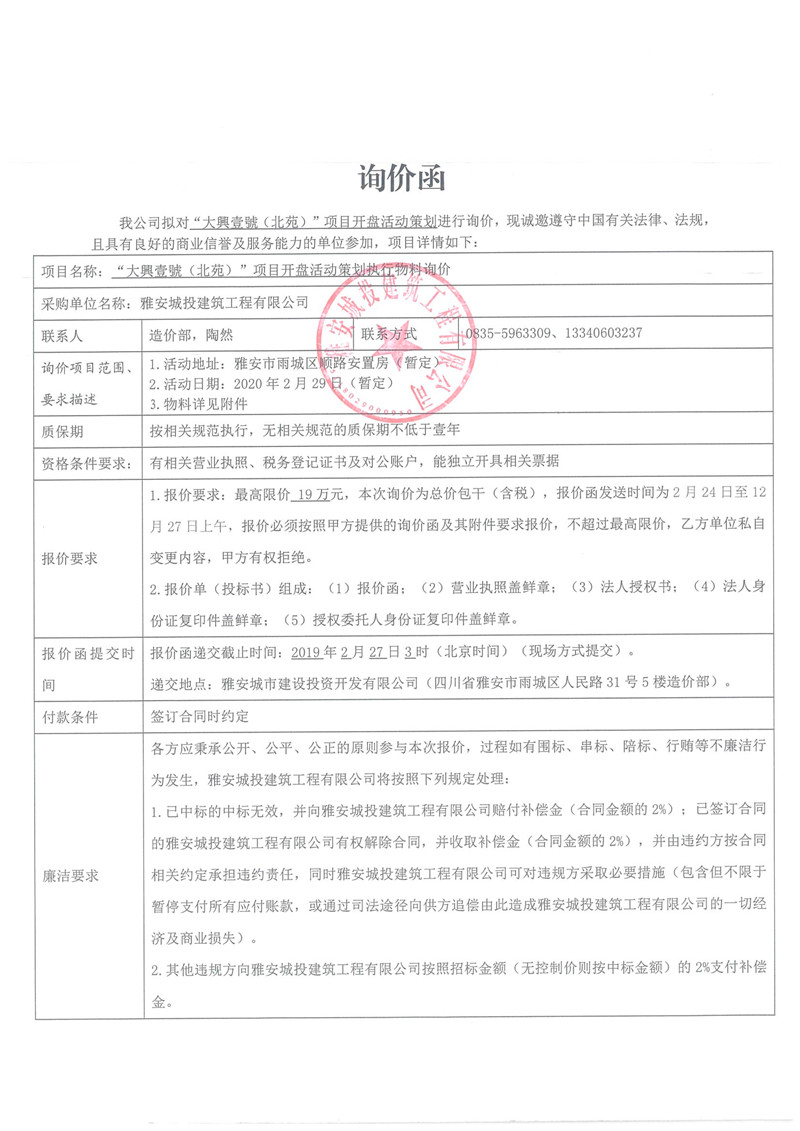“大興壹號(北苑)”項目開盤活動策劃詢價函