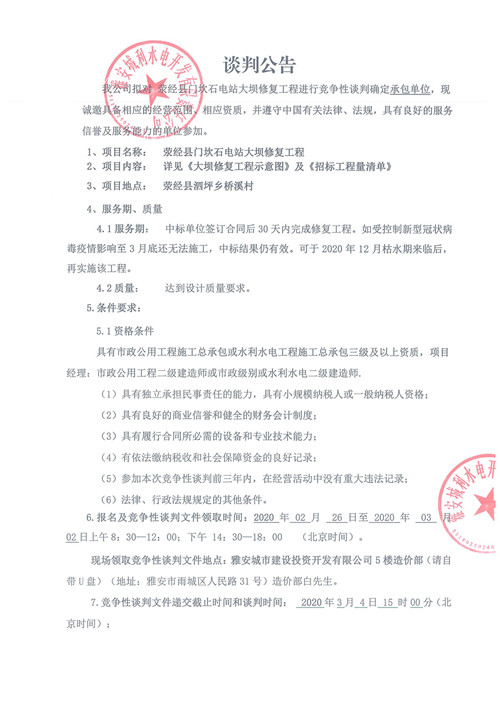 滎經(jīng)縣門(mén)坎石電站大壩修復(fù)工程競(jìng)爭(zhēng)性談判公告