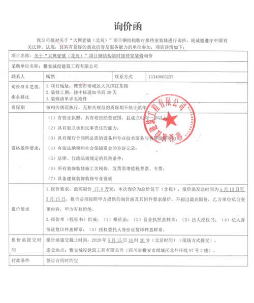 城投建工公司“大興壹號(北苑)”項目鋼結構臨時接待室裝飾裝修詢價函