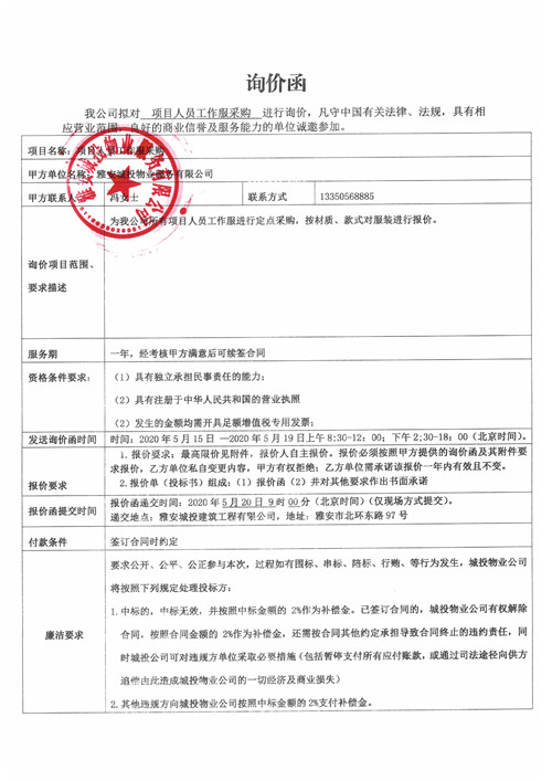 城投物業(yè)公司項目人員工作服采購詢價函