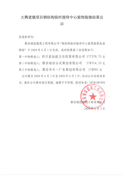 城投建工公司大興壹號項目鋼結構臨時接待中心裝飾裝修詢價函結果公示