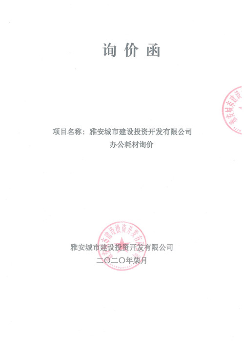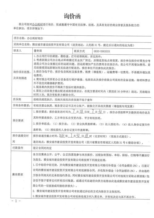 雅安城市建設投資開發(fā)有限公司辦公耗材詢價函