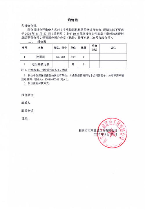 雅安市市政建設工程有限公司挖掘機租賃詢價函