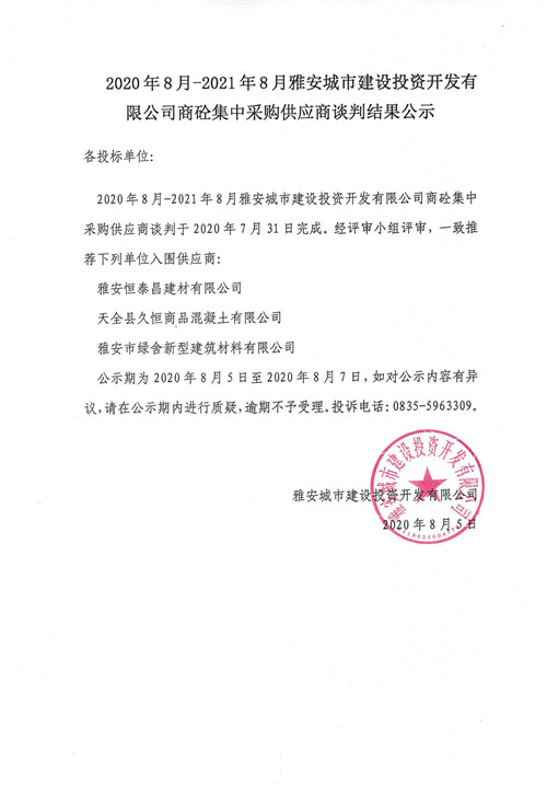 2020年8月-2021年8月雅安城市建設投資開發(fā)有限公司商砼集中采購供應商談判結果公示