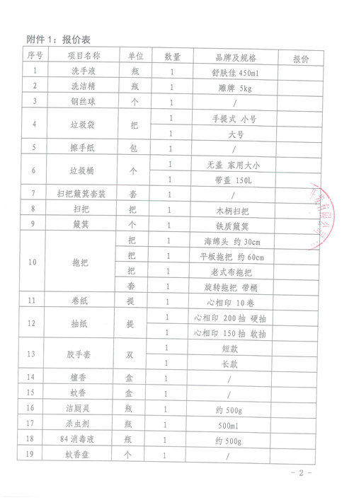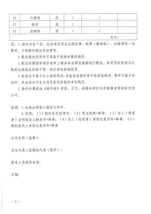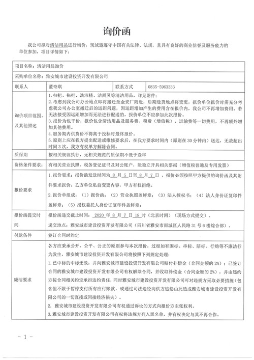 雅安城市建設(shè)投資開發(fā)有限公司清潔用品詢價函