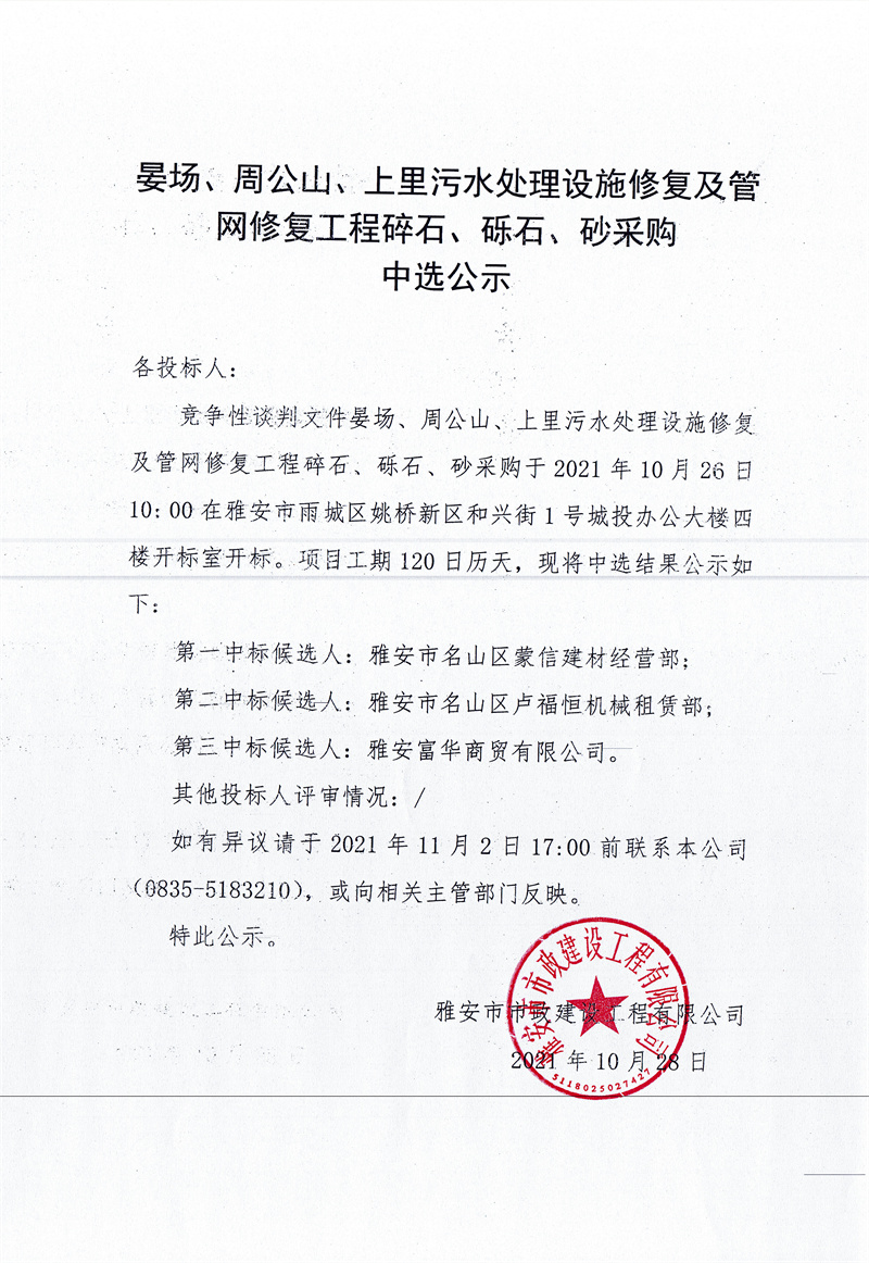 晏場、周公山、上里污水處理設施修復及管網修復工程碎石、礫石、砂采購中選公示