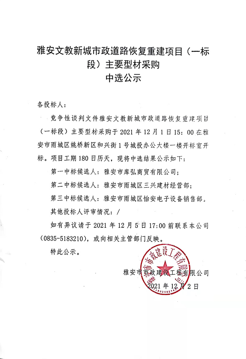雅安文教新城市政道路恢復(fù)重建項目(一標(biāo)段)主要型材采購中選公示