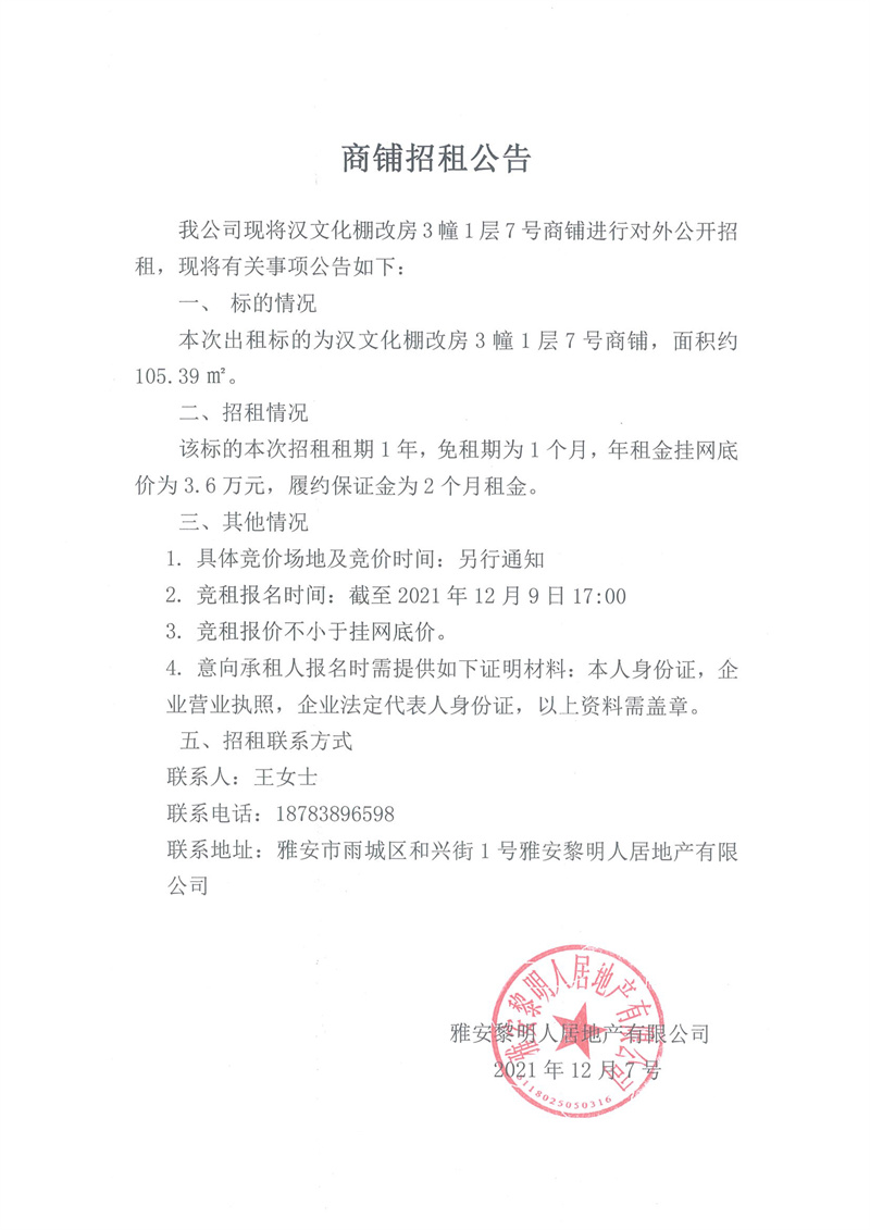 漢文化棚改房3幢1層7號(hào)商鋪招租公告
