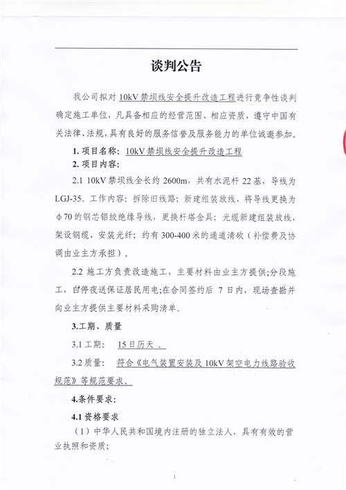 城利水電公司10kV禁壩線安全提升改造工程競爭性談判公告