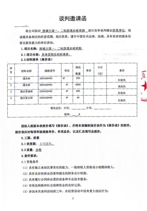 市政公司雨城大道一、二標(biāo)段透水磚采購競(jìng)爭性談判公告