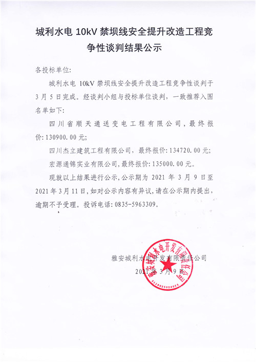 城利水電公司10kV禁壩線安全提升改造工程競(jìng)爭(zhēng)性談判結(jié)果公示