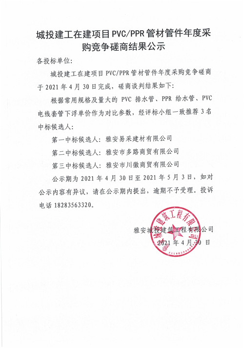 城投建工在建項目PVC/PPR管材年度采購磋商結(jié)果公示
