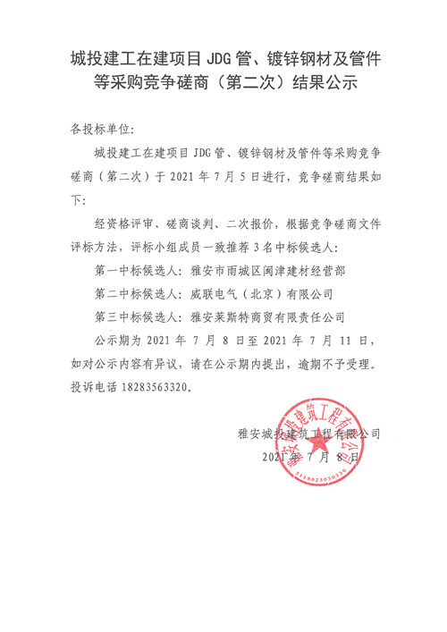 城投建工公司在建項目JDG管、鍍鋅鋼材及管件等采購競爭性磋商(第二次)結果公示