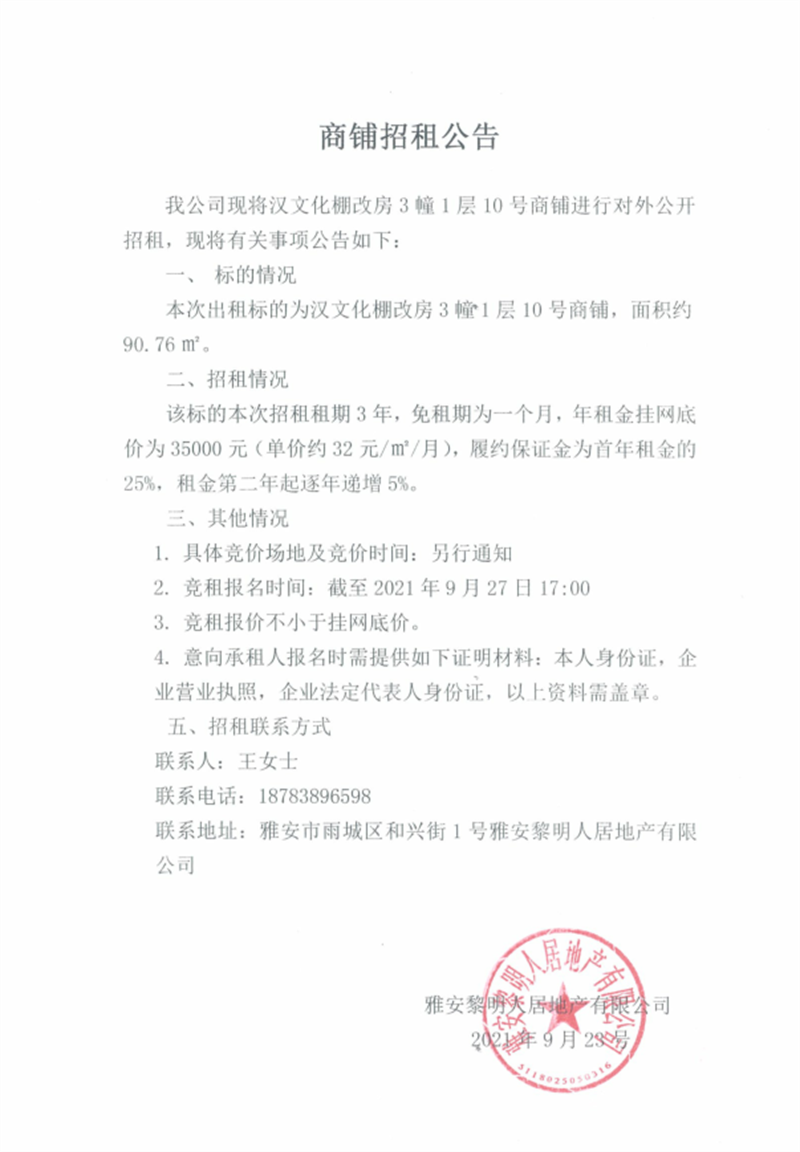 漢文化棚改房3幢1層10號商鋪對外招租公告