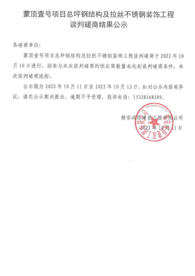蒙頂壹號(hào)項(xiàng)目總坪鋼結(jié)構(gòu)及拉絲不銹鋼裝飾工程談判磋商結(jié)果公示