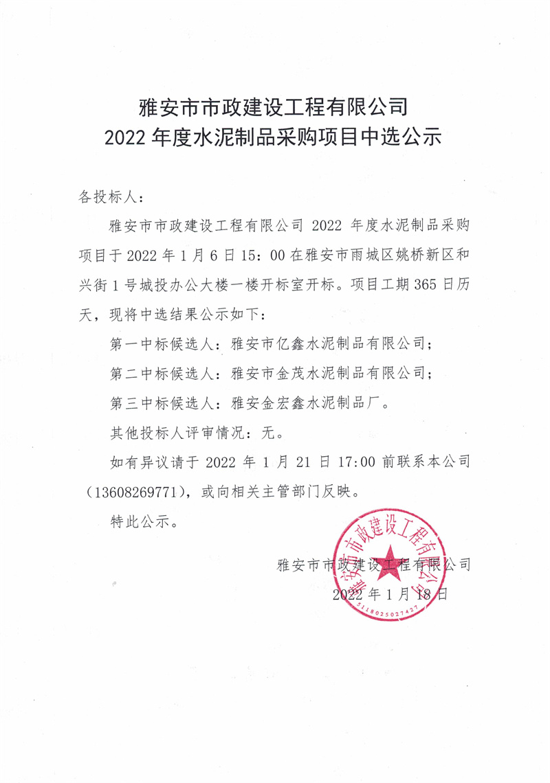 市政公司2022年度水泥制品采購(gòu)項(xiàng)目中選公示