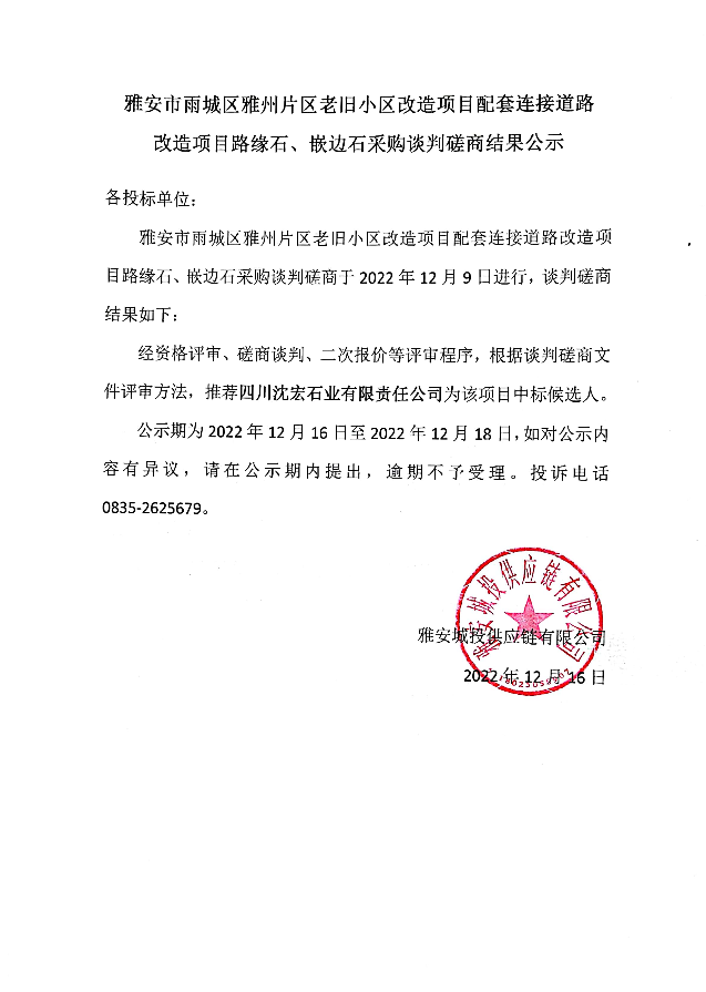 雅安市雨城區(qū)雅州片區(qū)老舊小區(qū)改造項(xiàng)目配套連接道路改造項(xiàng)目路緣石、嵌邊石采購(gòu)談判磋商結(jié)果公示