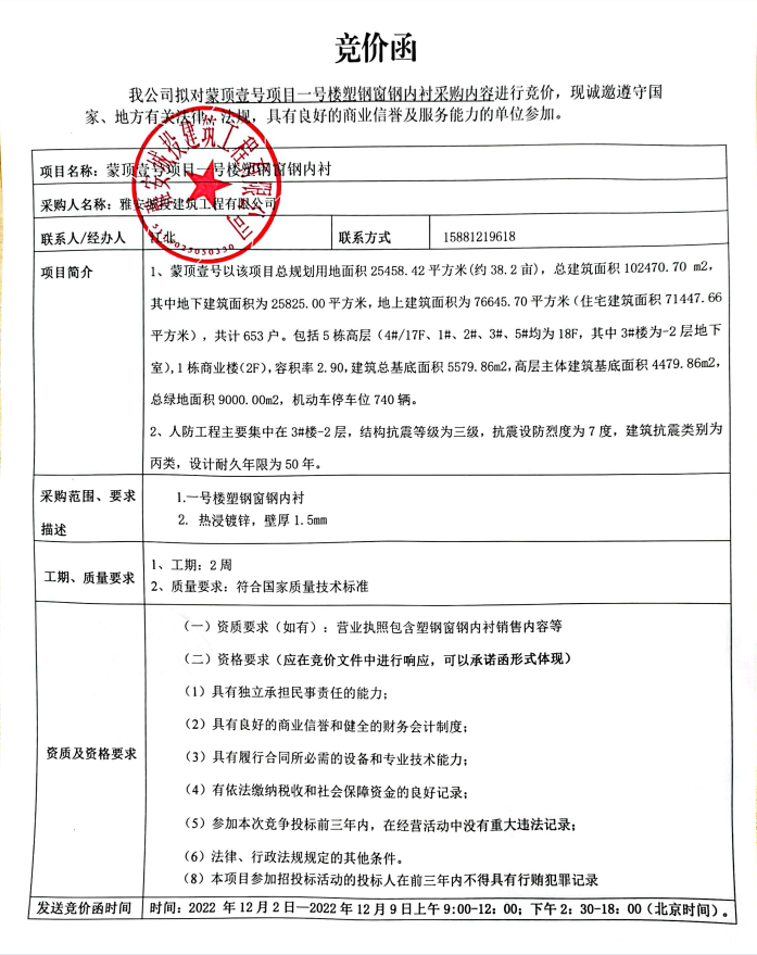 蒙頂壹號項(xiàng)目一號樓塑鋼窗鋼內(nèi)襯競價公告