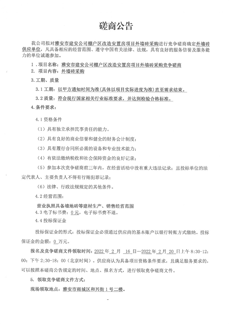 雅安市建安公司棚戶區(qū)改造安置房項目外墻磚采購競爭磋商公告