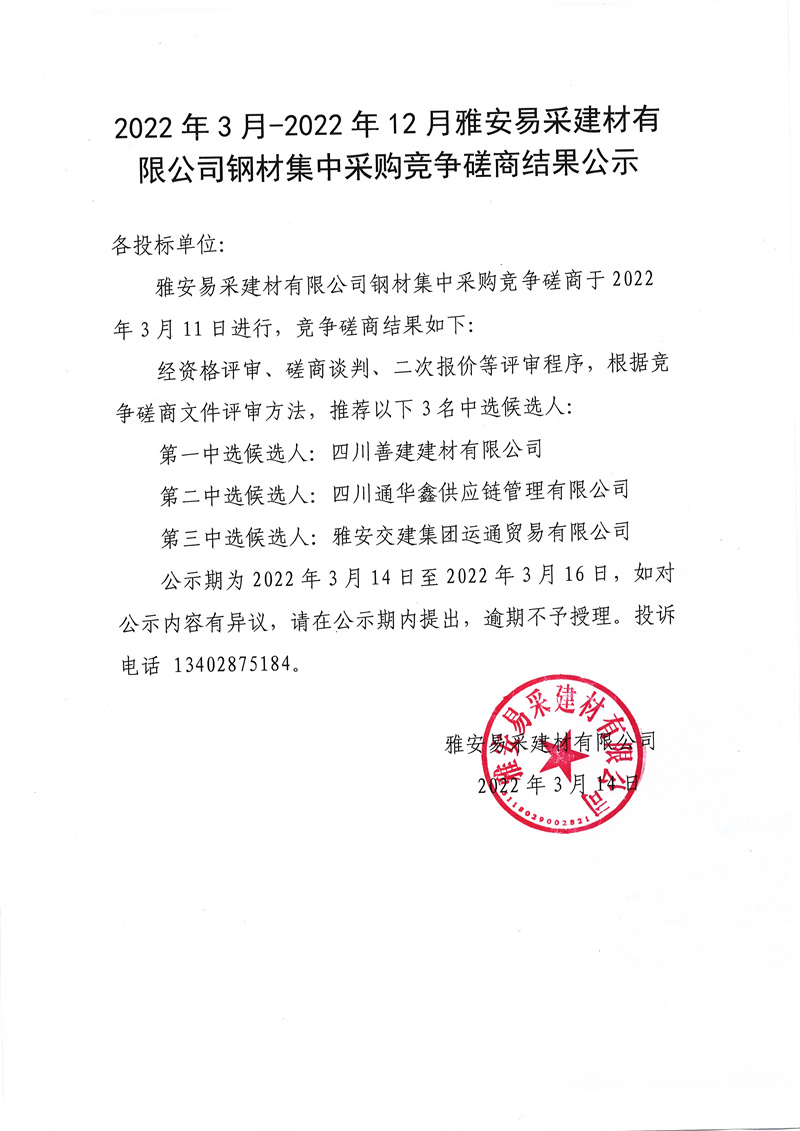2022年3月-2022年12月雅安易采建材有限公司鋼材采購競爭磋商結果公示