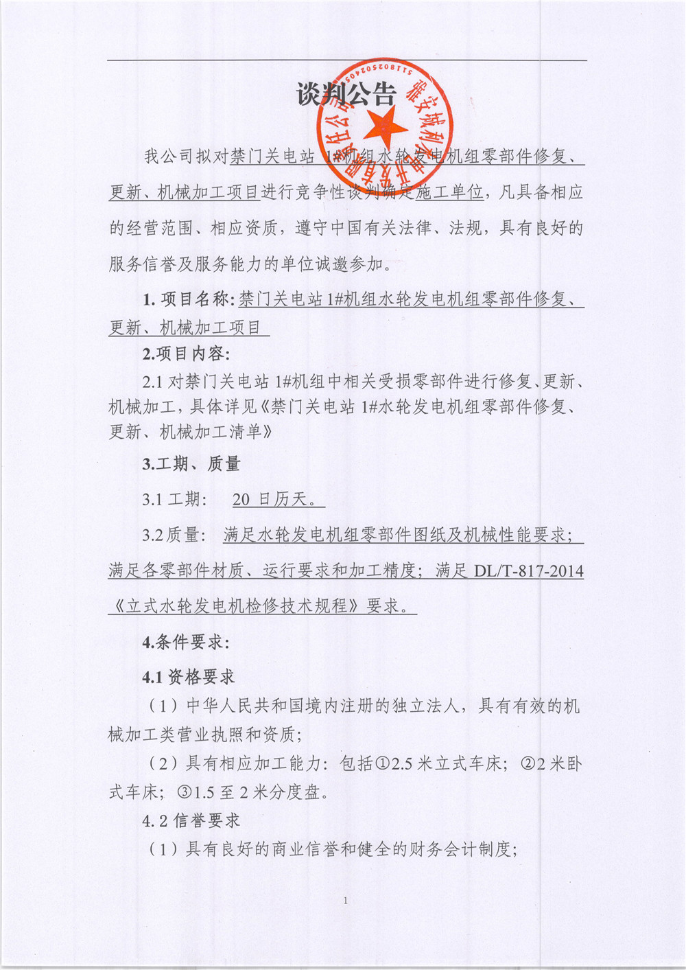 禁門關(guān)電站1#機(jī)組水輪發(fā)電機(jī)組零部件更新、機(jī)械加工項(xiàng)目競(jìng)爭(zhēng)性談判公告