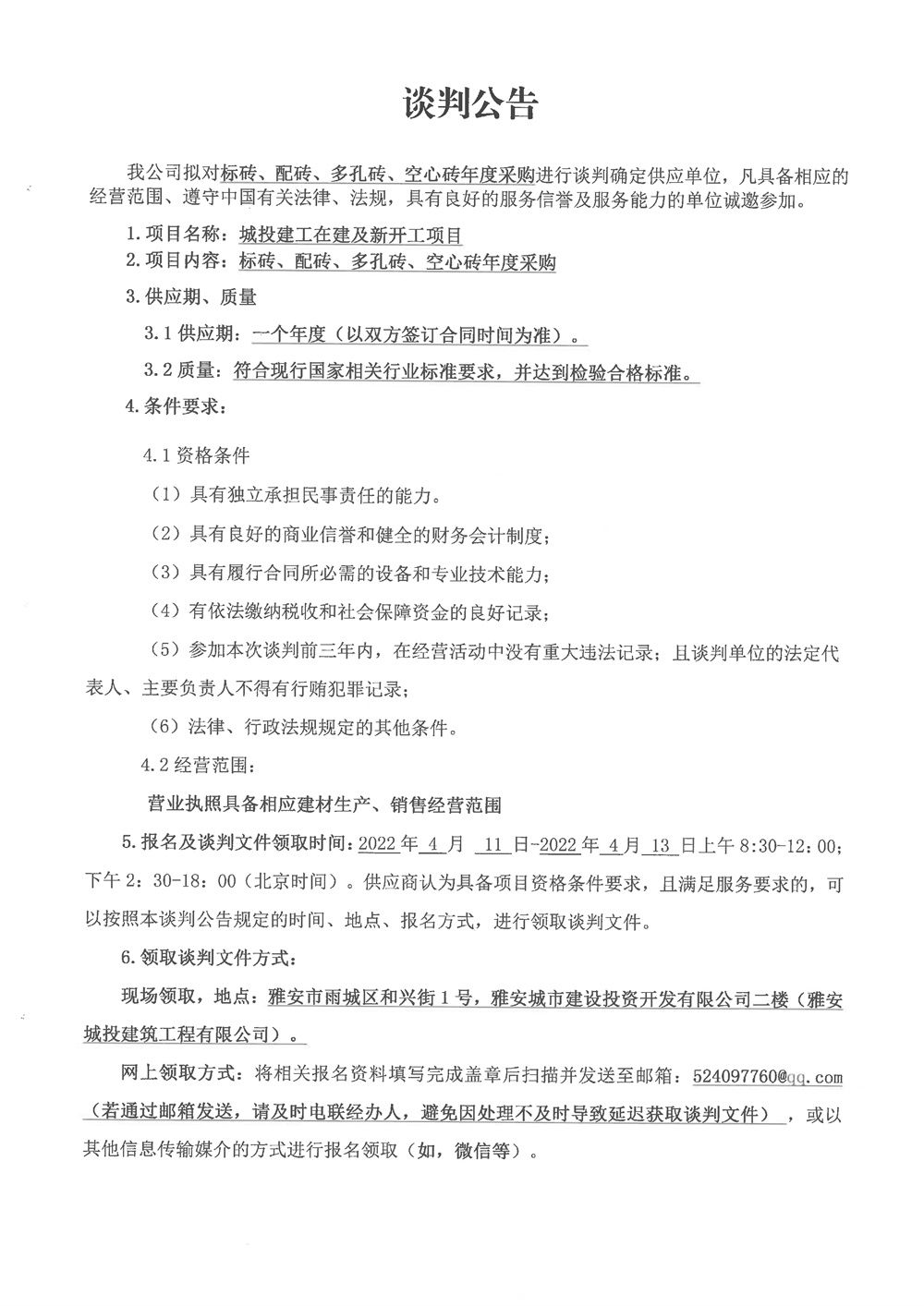 城投建工標(biāo)磚、配磚、多孔磚、空心磚年度采購競(jìng)爭(zhēng)性談判公告