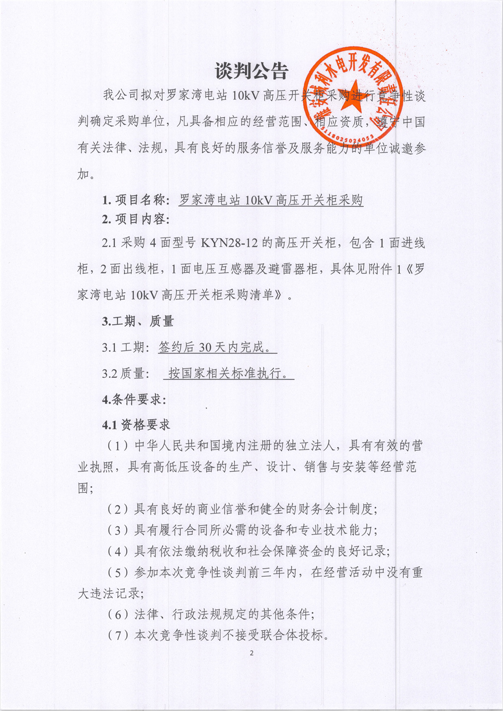 城利水電公司羅家灣電站10KV高壓開關(guān)柜柜采購競(jìng)爭(zhēng)性談判公告