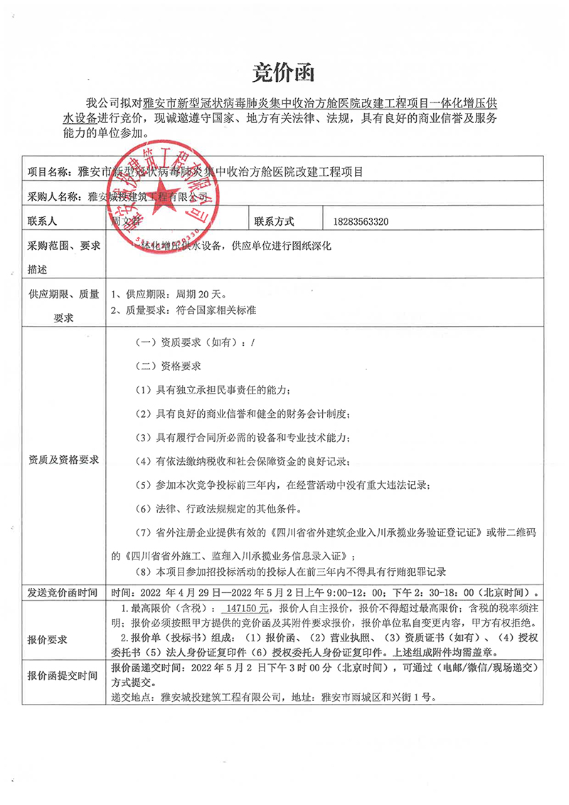 雅安市新型冠狀病毒肺炎集中收治方艙醫(yī)院改建工程項目一體化增壓供水設(shè)備競價函