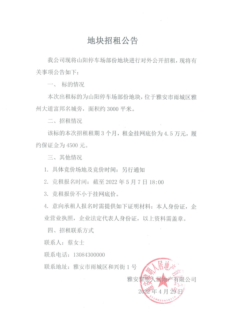 黎明人居公司山陽(yáng)停車(chē)場(chǎng)部分地塊招租公告
