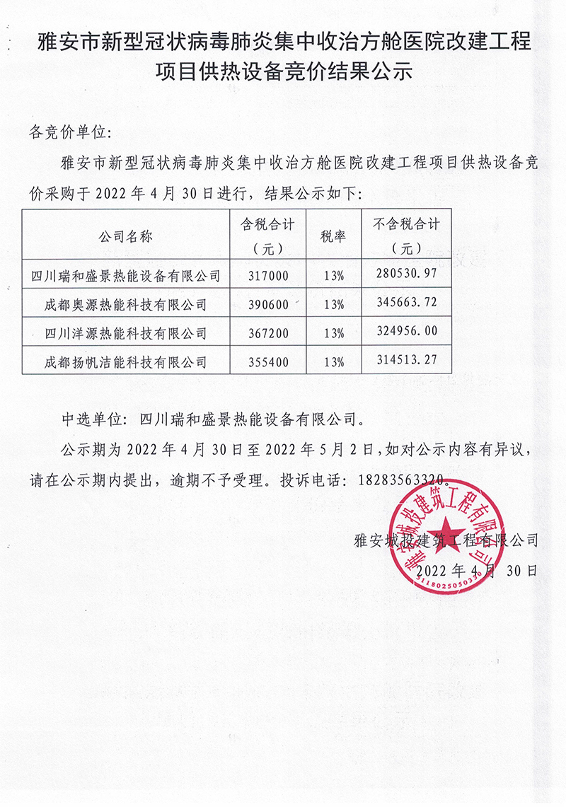 雅安市新型冠狀病毒肺炎集中收治方艙醫(yī)院改建工程項目供熱設(shè)備競價結(jié)果公示