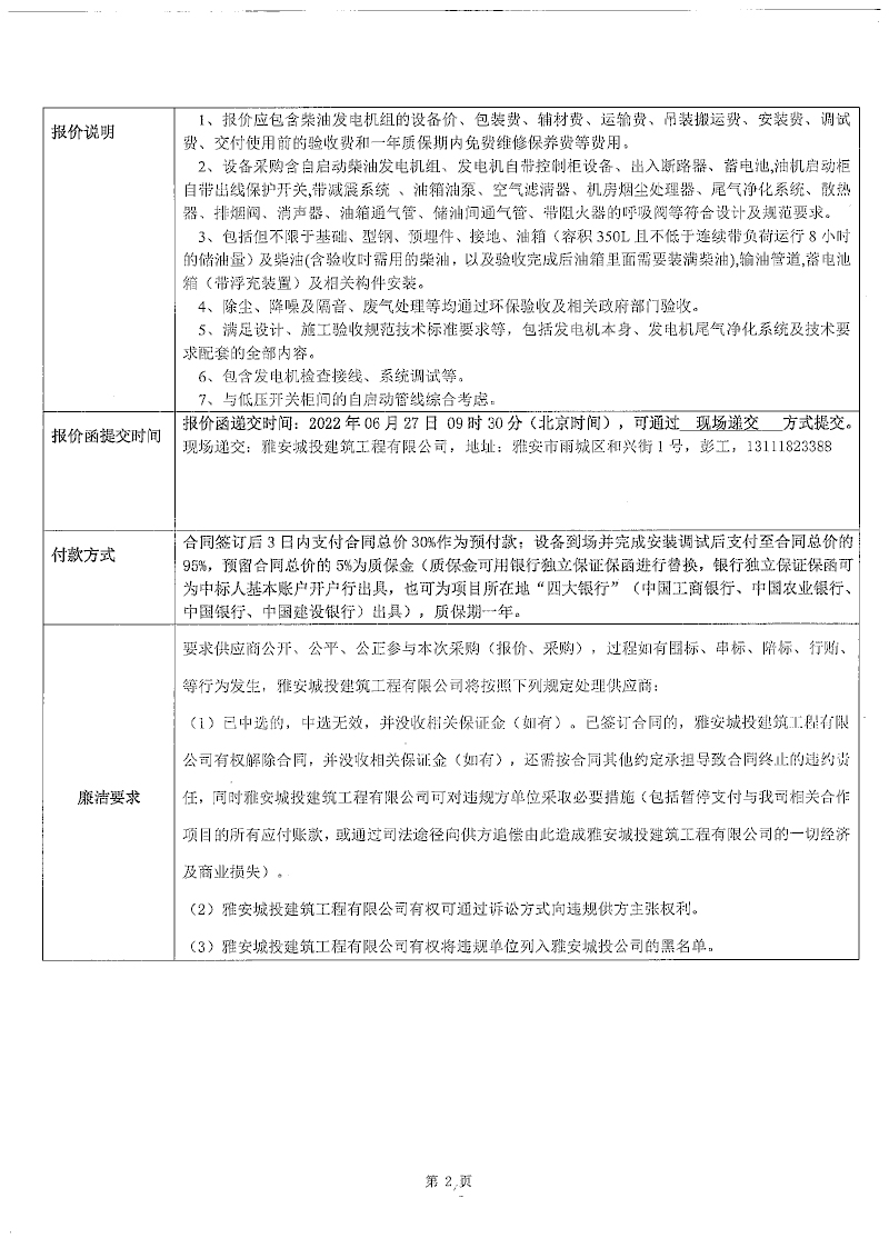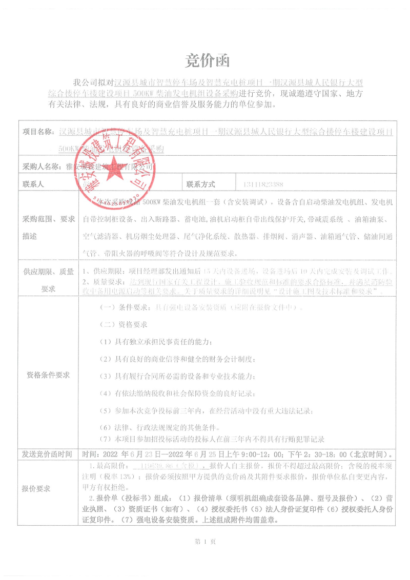 漢源縣城市智慧停車場(chǎng)及智慧充電樁項(xiàng)目一期漢源縣城人民銀行大型綜合樓停車樓建設(shè)項(xiàng)目500kw柴油發(fā)電機(jī)組設(shè)備采購(gòu)競(jìng)價(jià)公告