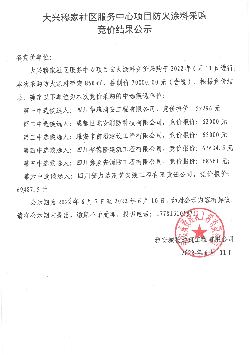 大興穆家社區(qū)服務(wù)中心項(xiàng)目防火涂料采購競價(jià)結(jié)果公示