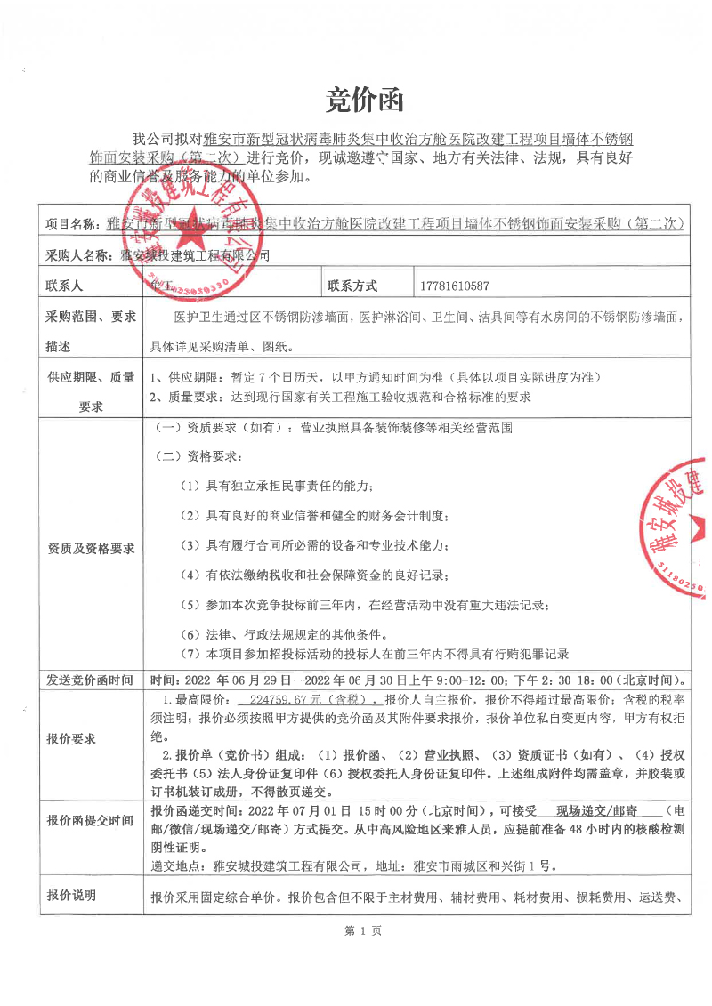 雅安市新型冠狀病毒肺炎集中收治方艙醫(yī)院改建工程項(xiàng)目墻體不銹鋼飾面安裝競價(jià)采購(第二次)