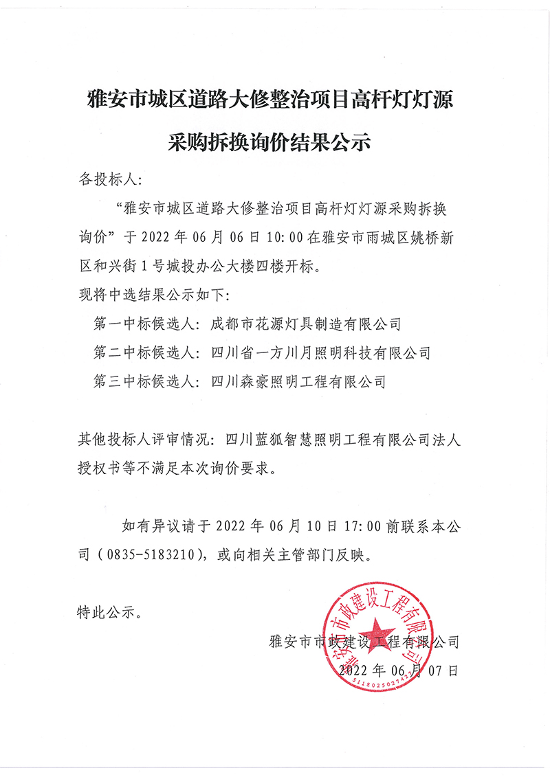 雅安市城區(qū)道路大修整改項(xiàng)目高桿燈燈源采購拆換詢價(jià)結(jié)果公示