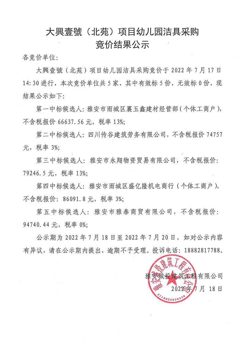 大興壹號(北苑)項目幼兒園潔具采購競價結果公示
