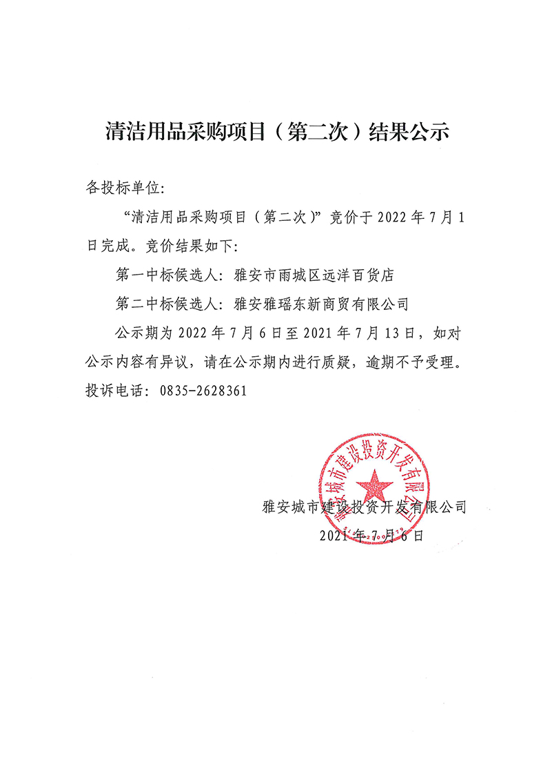 雅安城市建設投資開發(fā)有限公司清潔用品采購項目(第二次)結(jié)果公示