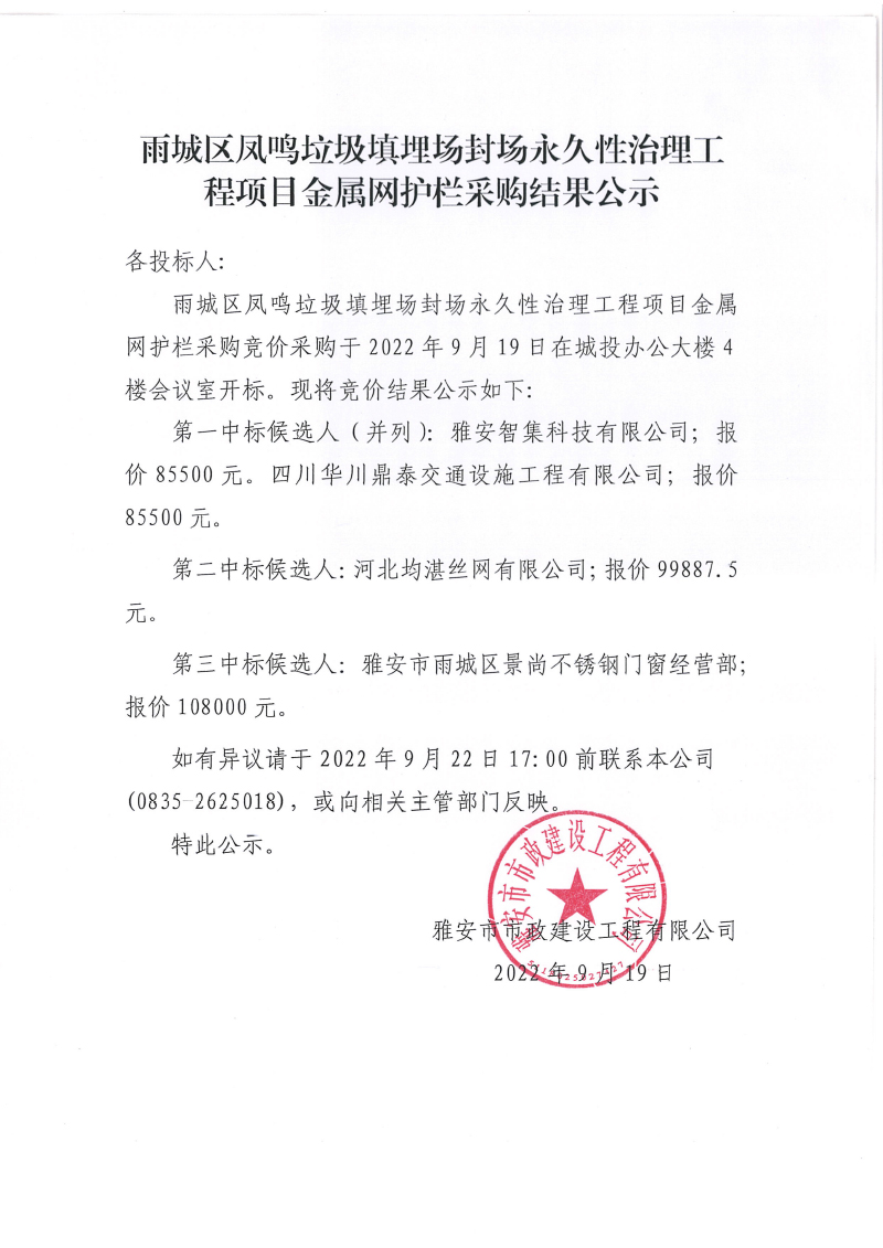 雨城區(qū)鳳鳴垃圾填埋場永久性封場治理工程項目金屬網(wǎng)護(hù)欄采購結(jié)果公示